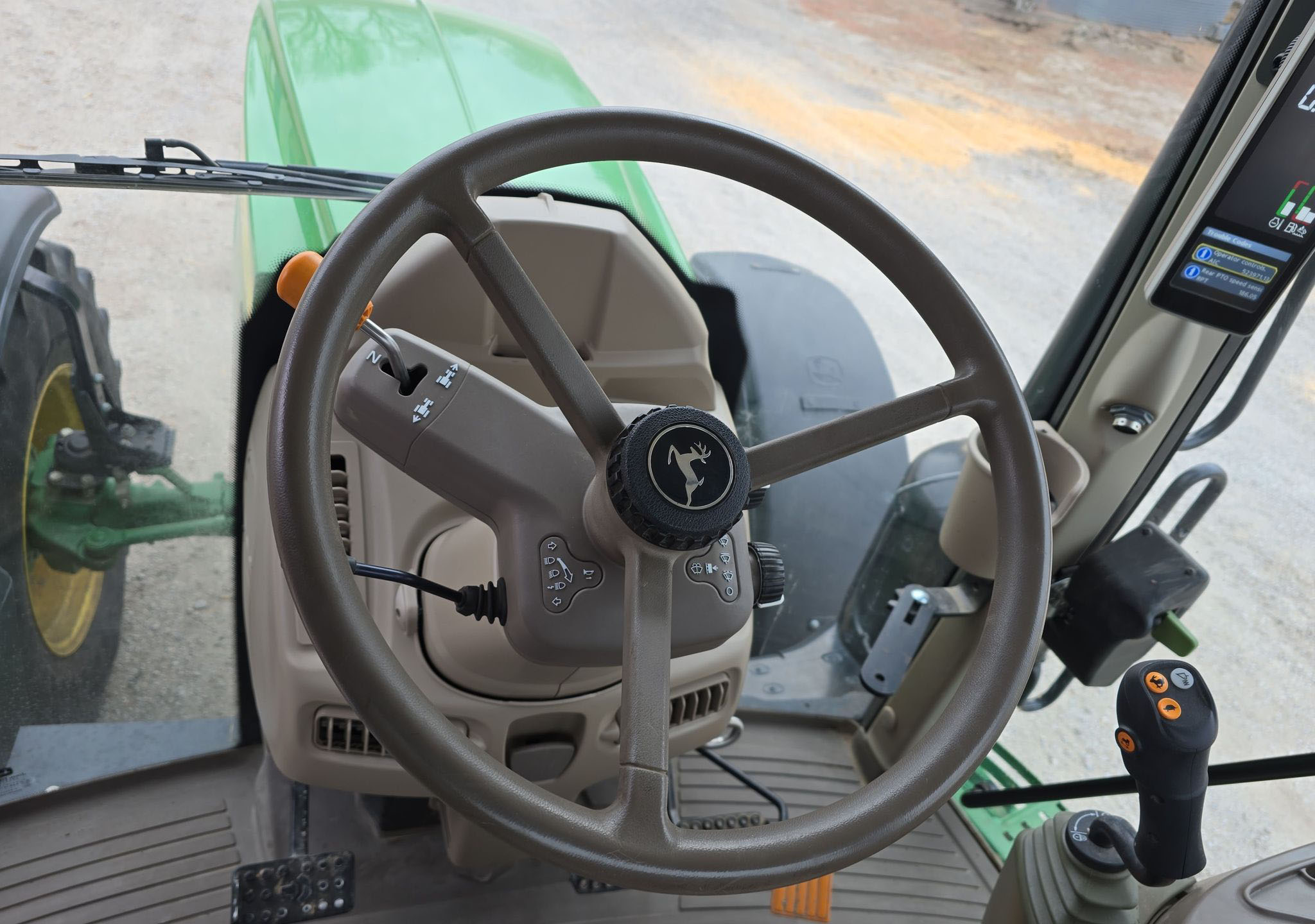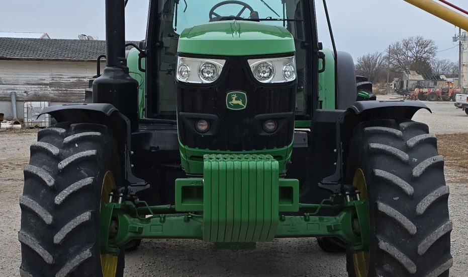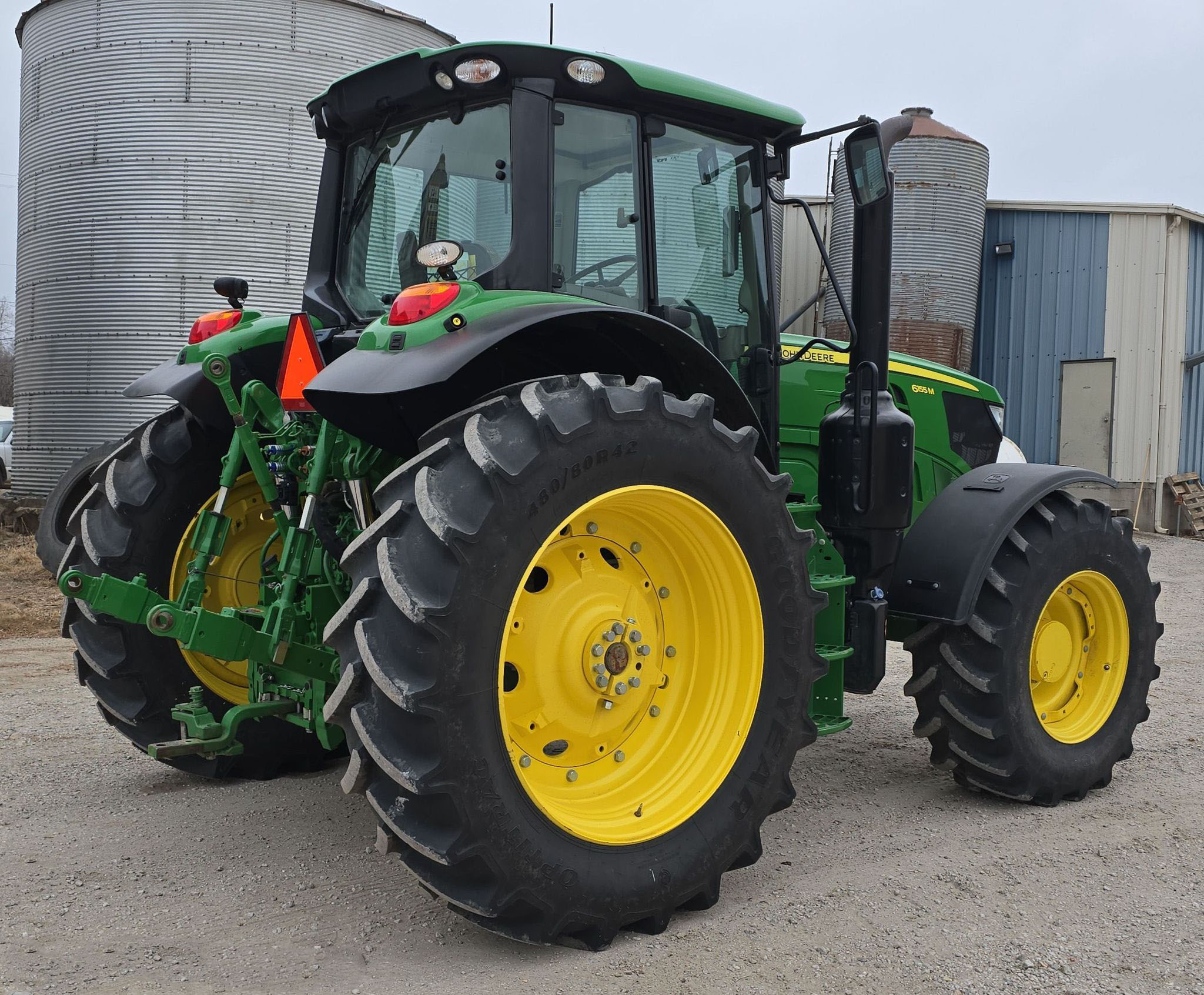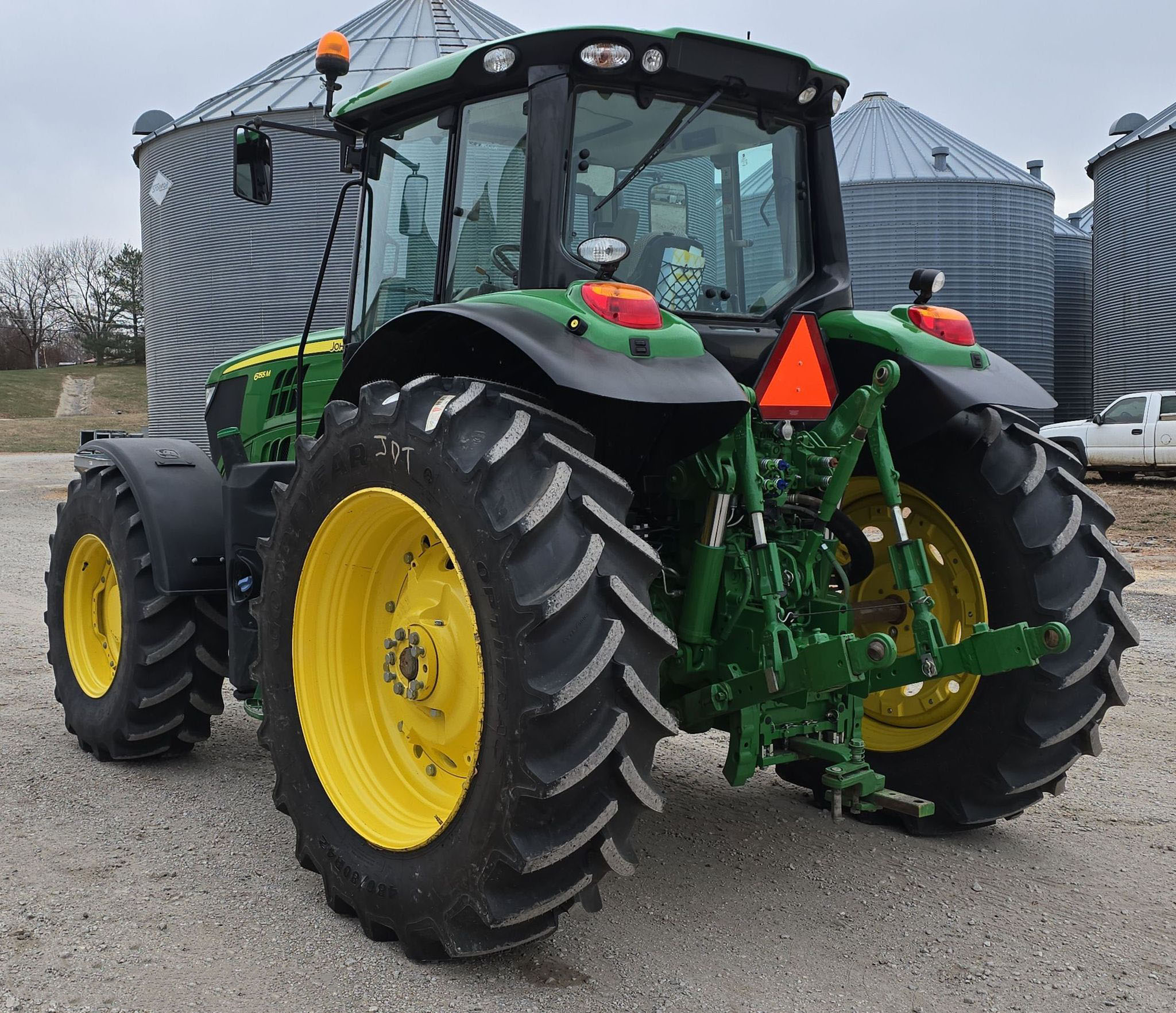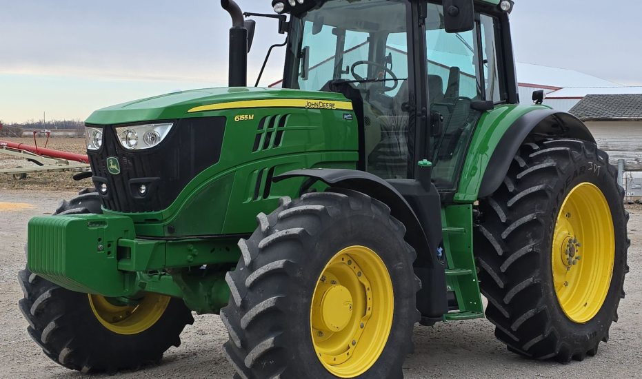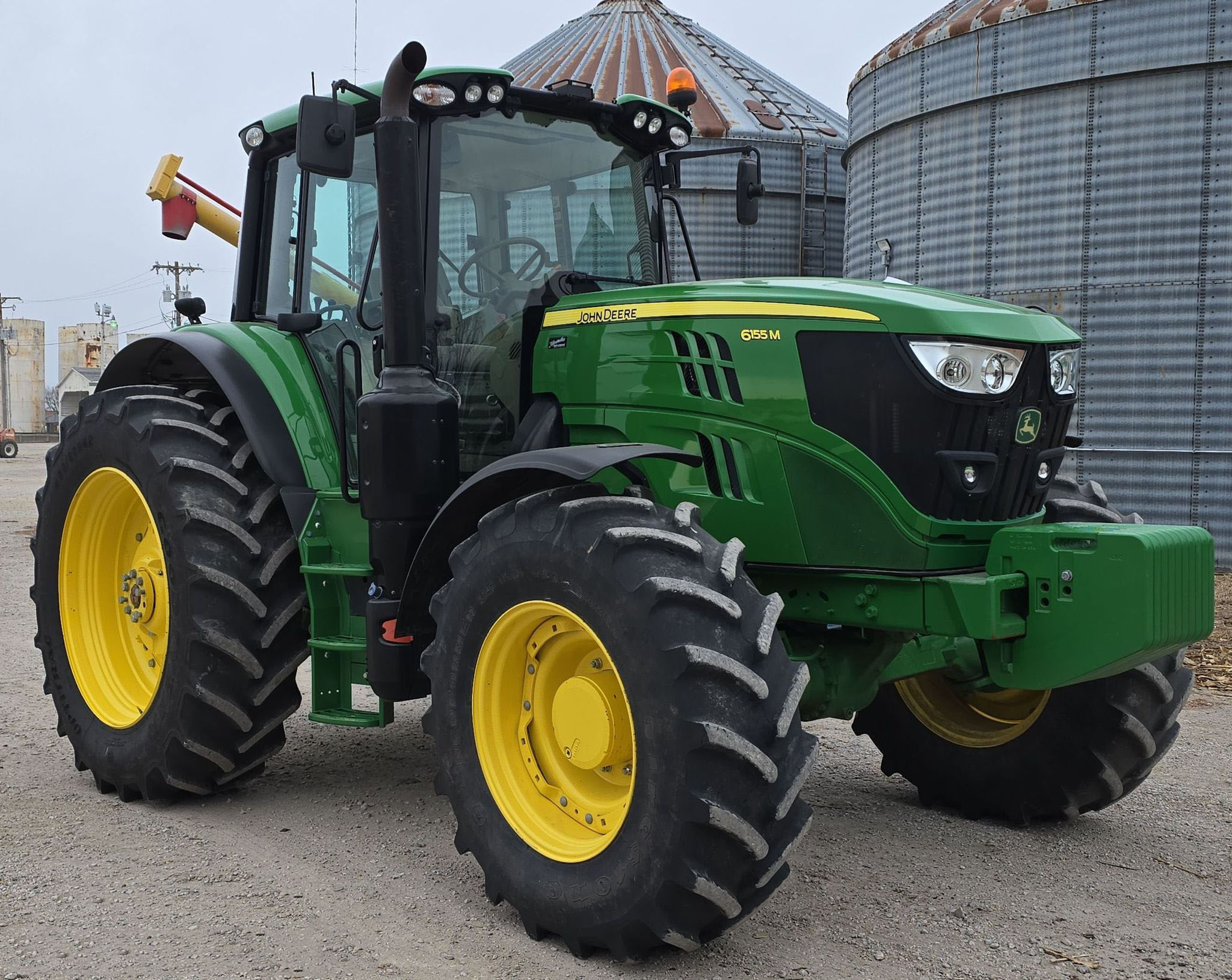 2021 John Deere 6155M MFWD tractor with 856 hours. Powered by a 6-cylinder diesel engine and equipped with a powershift transmission (20F-20R) and left-hand reverser for easy operation. Features include AC and heat in the operator's station, 540 PTO, three-point hitch with top link, seven-pin and ISOBUS outlets, and three hydraulic remote sets. The tractor also comes with 10 suitcase weights for added stability. Tires are 420/85R28 in the front and 480/80R42 in the rear, ensuring reliable traction and performance.