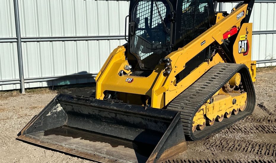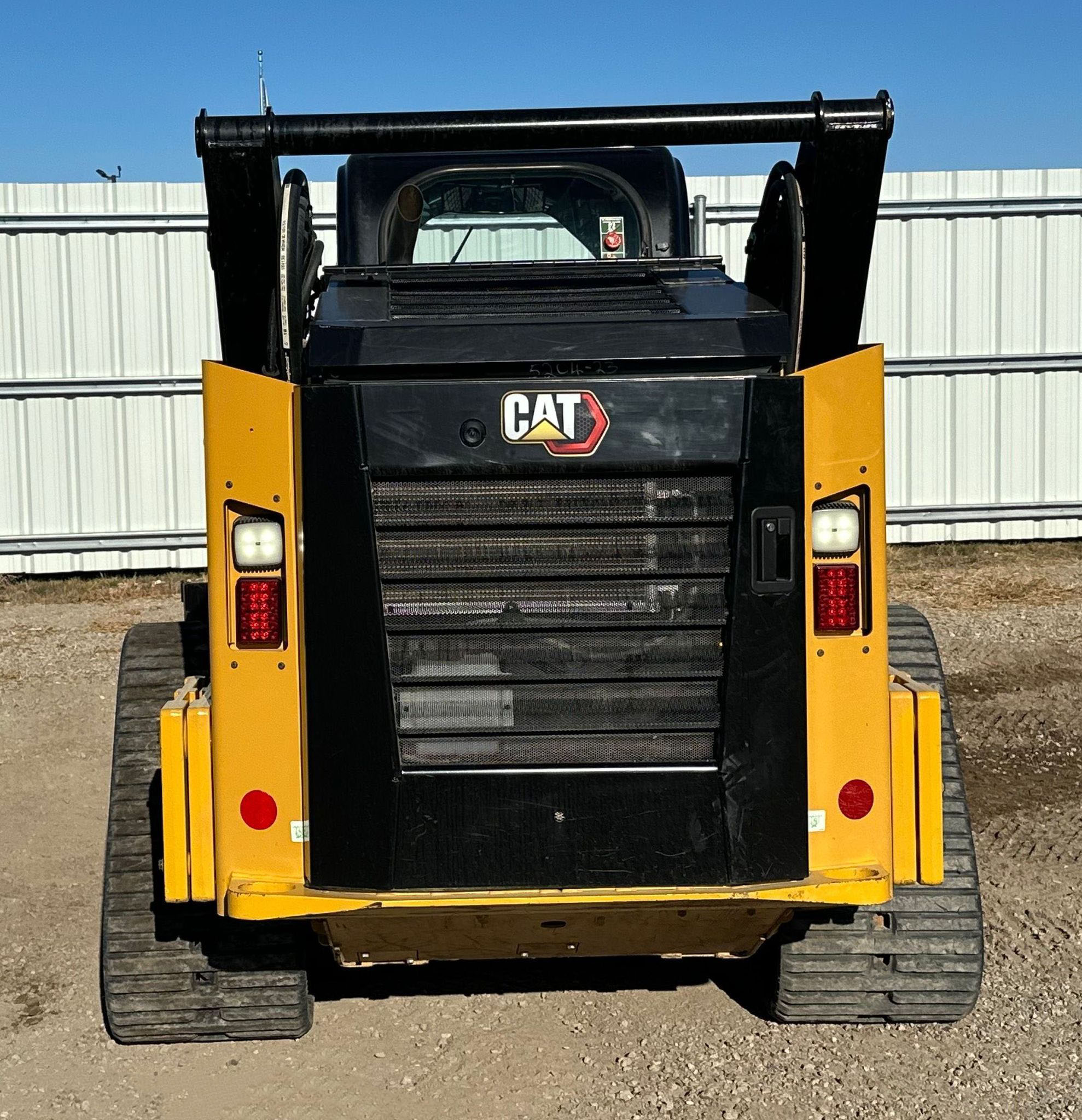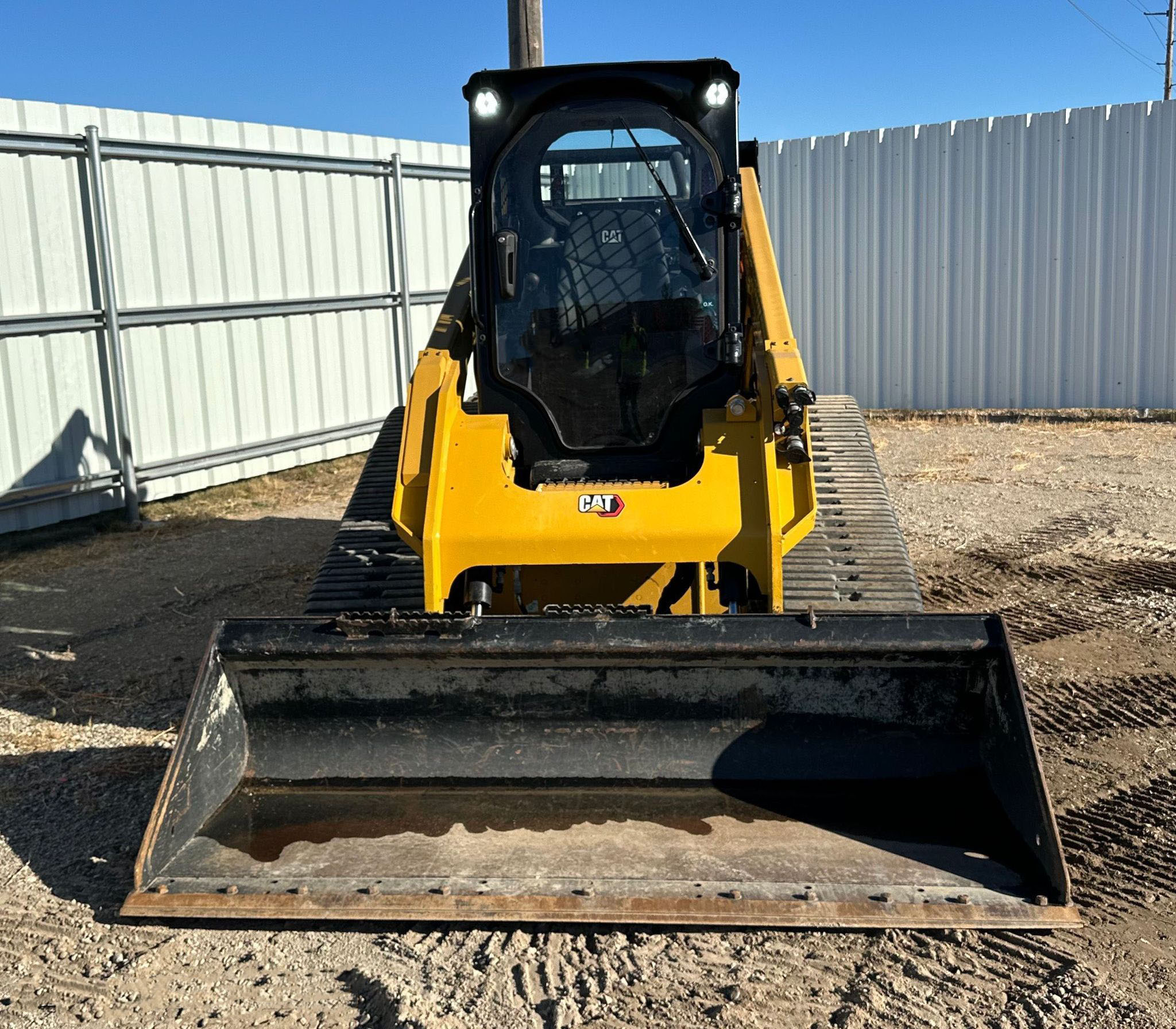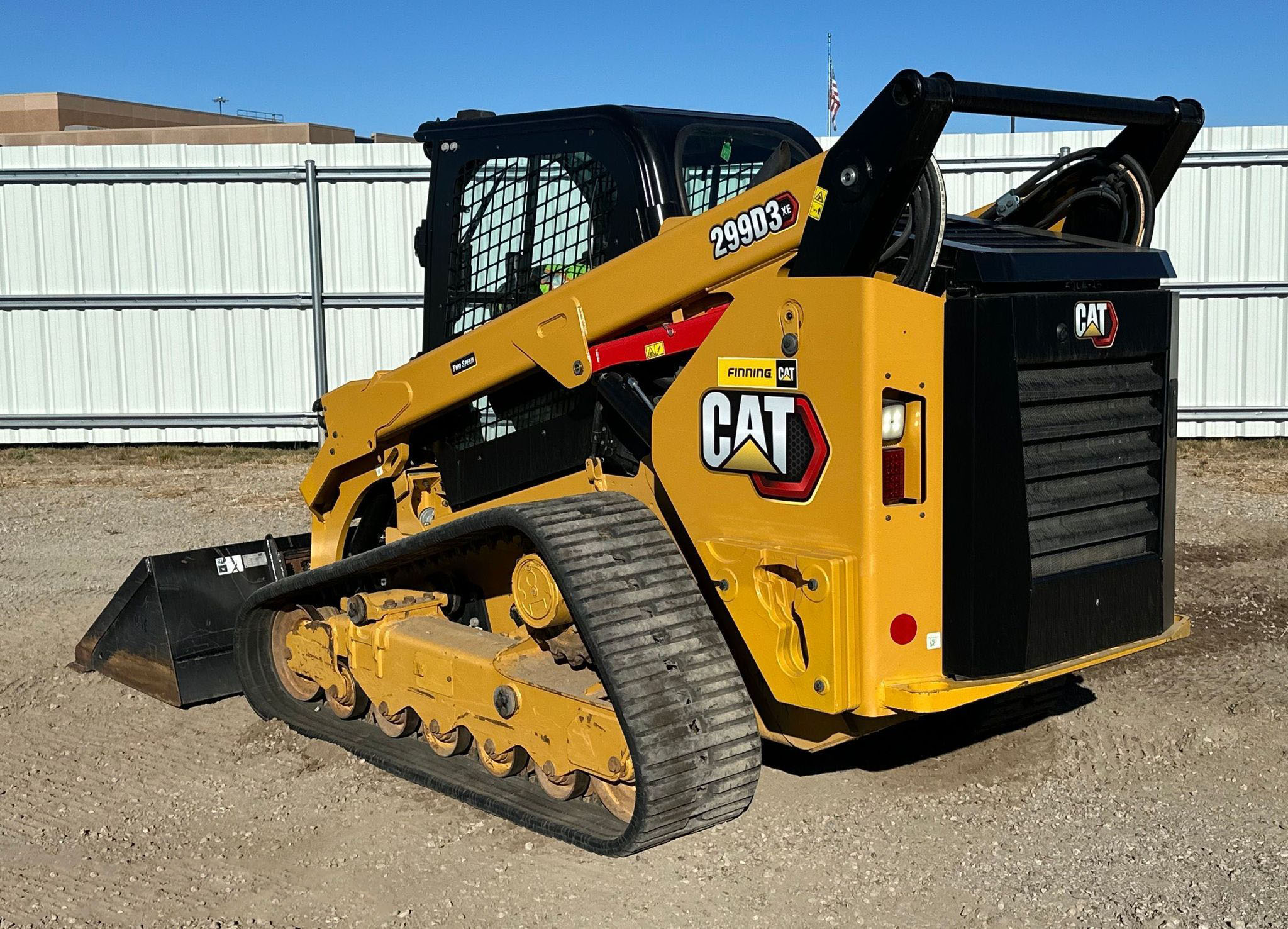 2023 Caterpillar 299D3 XE tracked skid steer loader with 532 hours. Powered by an 81.8 kW Caterpillar C3.8 DIT 4-cylinder diesel engine and hydrostatic transmission with two-speed travel. Features an enclosed cab with AC, heat, backup camera, hand-operated bucket control, pattern changer, and electronic monitoring system. Equipped with auxiliary hydraulics (high flow, high pressure), hydraulic quick coupler, and counterweights. Includes a 0.83 cu.yd. Caterpillar bucket (85" wide, bolt-on cutting edge) and 17.5" wide tracks.